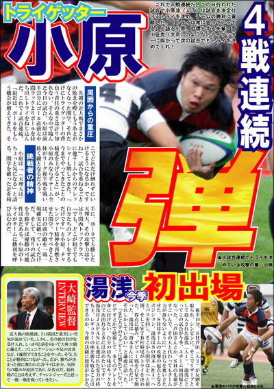 「(天理大は)ちょっと気になる」と語る。関学を破った近大を相手に、この日48―0で大勝した天理大。その攻撃力はやはり関西トップクラス。「でも、どこが相手でも自分たちのプレーをするだけです」と小原。チャレンジャー精神を再燃させた関学。目の前の敵を一戦一戦確実に破っていくだけだ。そして、残り試合を全勝すれば優勝の可能性はまだある。小原のトライがチームに勝利を呼び込むのだ。
